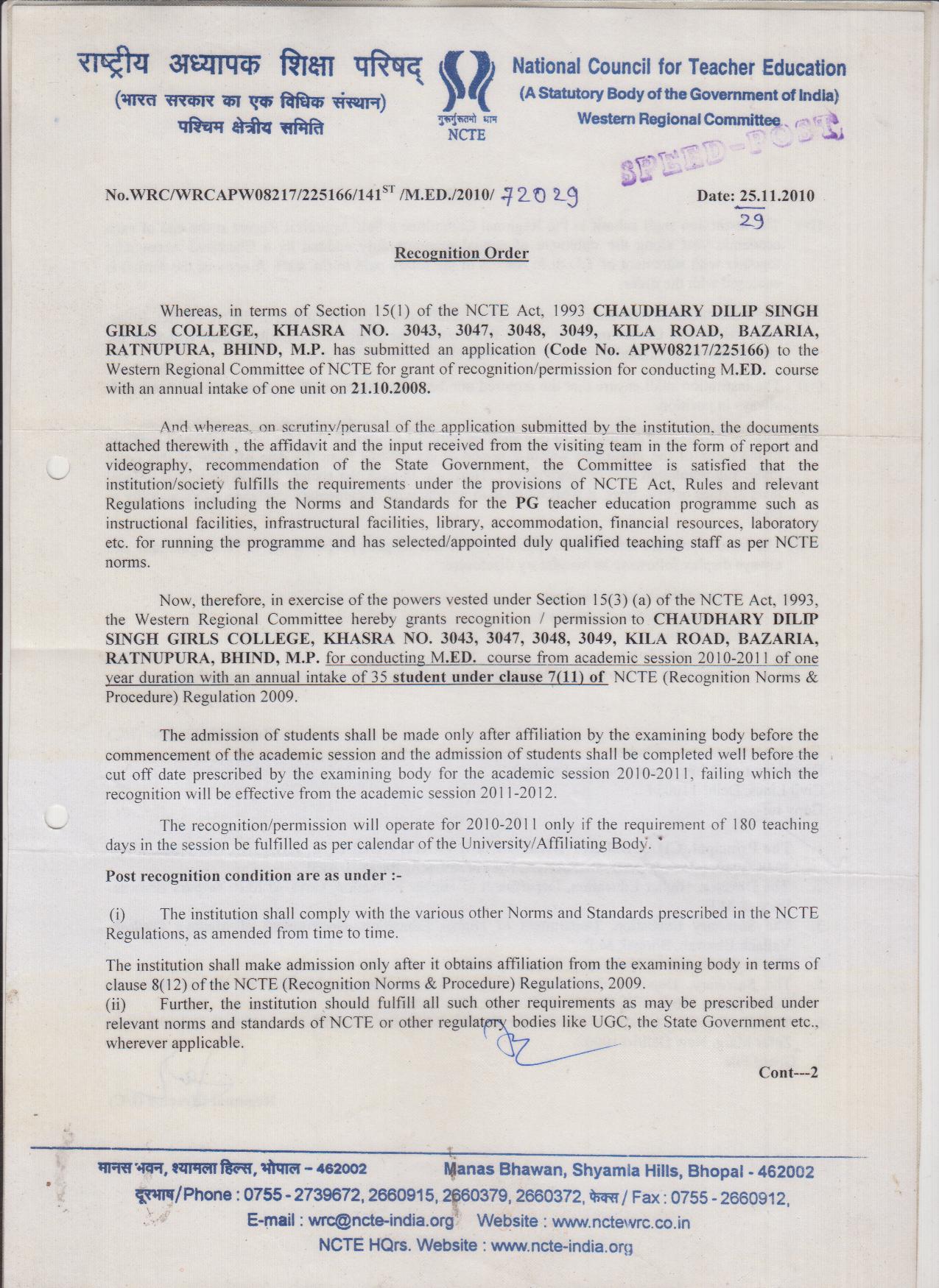 Recognition Letter (M.Ed.) | WRC/WRCAPW08217/ 225166 /141st /M.Ed. /2010/ 72029 | Click Here |