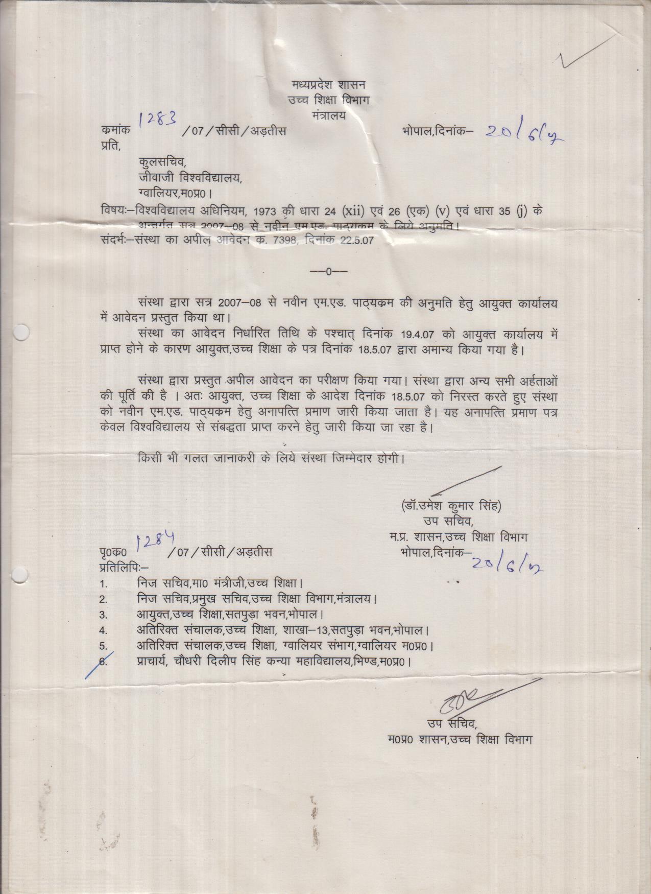 NOC Letter (M.Ed.) | No. 1283/07/CC/38 dated 20/06/07 | Click Here |